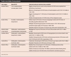 The contribution of forests and woodlands to national economies through production of gums and resins, medicinal plants, honey and beeswax, and bushmeat, though not quantified, is quite considerable. Table 1 shows some of the main NTFPs traded in Africa. Sudan, for instance, is the biggest producer of gums and resins in the world, commanding over 80 percent of global production. The potential for increased production of gums and resins in Sudan as well as the neighboring states of Kenya, Chad, Eritrea, Ethiopia and Central Africa Republic is huge.