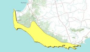 This ecoregion extends to the elevated plateau of the Yilgarn Block to the north. The extreme western tip of this ecoregion includes the Leeuwin-Naturaliste Ridge, and just to the east, the Scott River Plain as it gradually slopes down from the Blackwood Plateau. The landscape throughout much of this ecoregion is subdued, and largely consists of Proterozoic rocks, sometimes overlain with Eocene marine sediments. Prolonged leaching led to the development of the low-nutrient soils characteristic of this region. Significant granite monadnocks are located in the Walpole-Denmark region. Higher landscape diversity is seen here, with hills, ridges, steep river valleys, dune systems, and coastal cliffs. In general, this southwestern corner of Australia has a cool Mediterranean climate, with high average rainfall and a marked summer drought. Rainfall can approach 1,400 millimeters (mm) per annum along the coast, but decreases rapidly with distance from the coast. Rainfall is less seasonal in this ecoregion than in other portions of southwest Australia.